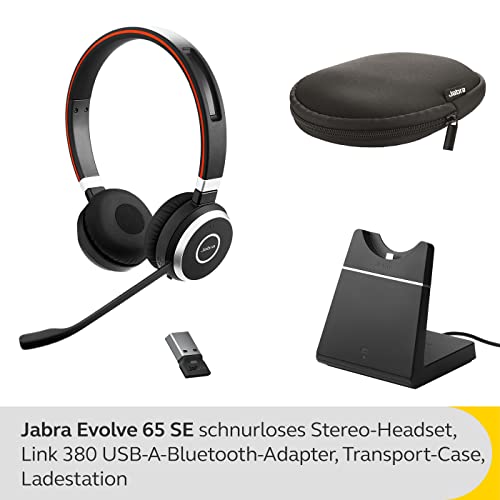 Lieferumfang: 1 x Jabra Evolve 65 SE Schnurloses Mono-Headset mit Link 380 USB-A-Adapter, Ladestation, USB-Ladekabel, Neoprentasche und Sicherheitsdatenblatt – Headsetgewicht: 282 g – Schwarz