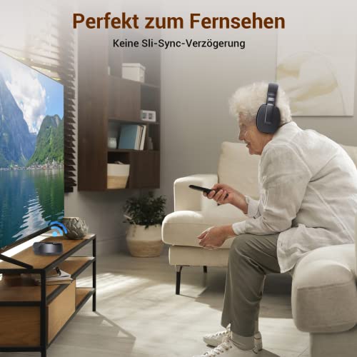 Problemlose Einrichtung: Plug-and-Play, kein Koppeln erforderlich, einfach den Sender an eine Stromquelle und den Audioausgang Ihres Fernsehers anschließen, alles einschalten, sie werden schnell miteinander verbunden. Ein Sender kann zwei oder mehr koppeln TV-Kopfhörer gleichzeitig kann der hinzugefügte Kopfhörer manuell gekoppelt werden. Es ist sehr bequem für Senioren / ältere Menschen zu verwenden.