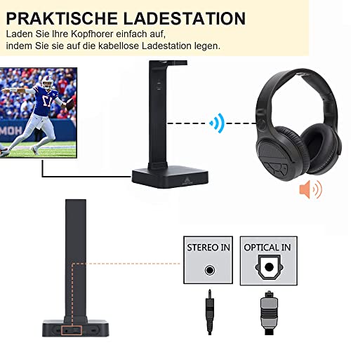 🎧📺【TV-Kopfhörer mit Ladestation】: Keine kopplung erforderlich, stecken Sie einfach das Sender-Dock in den Audioausgang Ihres Fernsehers, schalten Sie alles ein, sie verbinden sich schnell miteinander. Wenn der Akku schwach ist, dient die Senderbasis gleichzeitig als Ladestation; Legen Sie den kopfhörer kabellos einfach auf die Ladestation, er beginnt mit dem Aufladen und ist innerhalb von 3 Stunden wieder einsatzbereit.