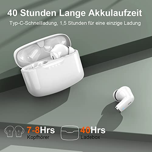 Lange Lebensdauer: Mit einer Kopfhörerkapazität von 50 mAh und einer Ladekapazität von 400 mAh halten die Ohrhörer 8 Stunden bei normalem Gebrauch (60% Volumen) und die Ladeschale hält 40 Stunden für 8 Ladungen, was Ihnen eine hervorragende Erfahrung mit langer Lebensdauer bietet. Dank USB-C-Schnellladung kann die Ladebox in nur 1,5 Stunde vollständig aufgeladen werden.